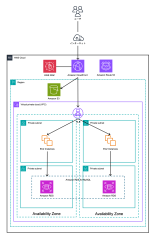 アプリケーションはALB(Application Load Balancer)配下のEC2インスタンスで稼働させており、データベースは可用性を重視してMulti-AZ(Availability Zone)構成のAmazon RDS for MySQLを選択しました。画像などの静的コンテンツは、Amazon S3で管理しています。