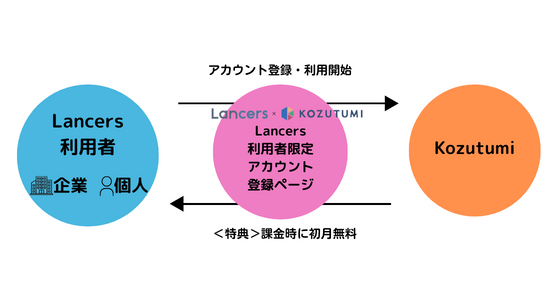 『Lancers』利用者様は、専⽤に⽤意された「Kozutumiアカウント登録画⾯」から『Kozutumi』を利⽤開始することで正式ローンチまで完全に無料利⽤可能です。また、『Kozutumi』の正式ローンチ後に有料利⽤する際に1ヶ⽉⽬がさらに無料となります。キャンペーン情報は、Lancersユーザー様向けに配信予定です。