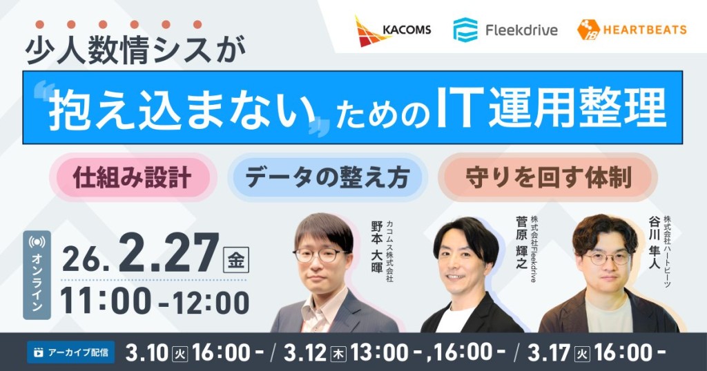株式会社Fleekdrive主催ウェビナー「少人数情シスが“抱え込まない”ためのIT運用整理 〜仕組み設計・データの整え方・守りを回す体制〜」にハートビーツが登壇します。