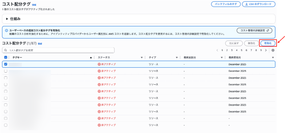 コスト配分に利用したいタグキーを選択し、「有効化」をクリックします。有効化はタグキー単位で行われ、そのキーを持つすべてのタグ値が集計対象となります。
